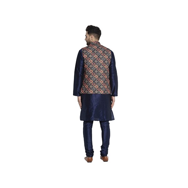 Benstoke Mens Dupion Silk Navy Kurta pajama with Multiclour Nehru jacket set