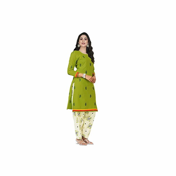 Pure cotton fabric is used for creating this ethnic salwar suit set, it has a natural texture with a gentle feel and very comfortable for wearing on casual outings and daily wear.This salwar suit set is a fine combination of perfect stitching and simple design with 3/4th sleeves, a round neck & knee-length kurta along with a comfy salwar makes it a simple yet beautiful piece for your wardrobe. The green colour kurta with contrasting block print is reflecting a delicate look and an allover printed salwar & dupatta is perfectly complementing the set.