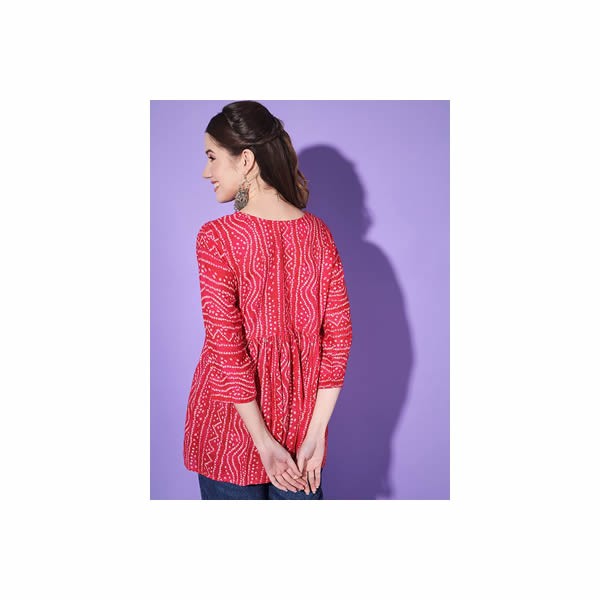 new short flared short kurta top, flares on waist area, 3/4th sleeves, round neck, small knot on neck area, made with soft and comfortable cotton fabric , goes best with jeans for your normal days. Size Chart In Inches - Size : M "Bust 38 Length 29" Size : L "Bust 40 Length 29" Size : XL "Bust 42 Length 29" Size : XXL "Bust 44 Length 29"