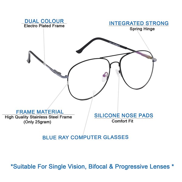Full Rim Retro Aviator Spectacle Frame For Men And Women (Antiglare & Blue Ray Blocking/ Demo Lens) (7905_Black)