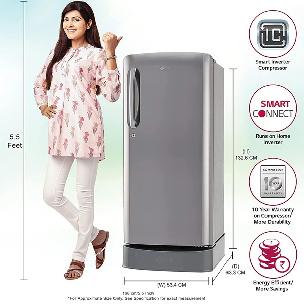 LG 190 L 4 Star Inverter Direct Cool Single Door Refrigerator (GL-D201APZY, Shiny Steel, Base Stand with Drawer)