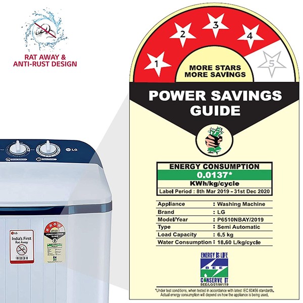 LG 6.5 Kg 4 Star Semi-Automatic Top Loading Washing Machine (P6510NBAY, Dark Blue, Rat Away Technology)