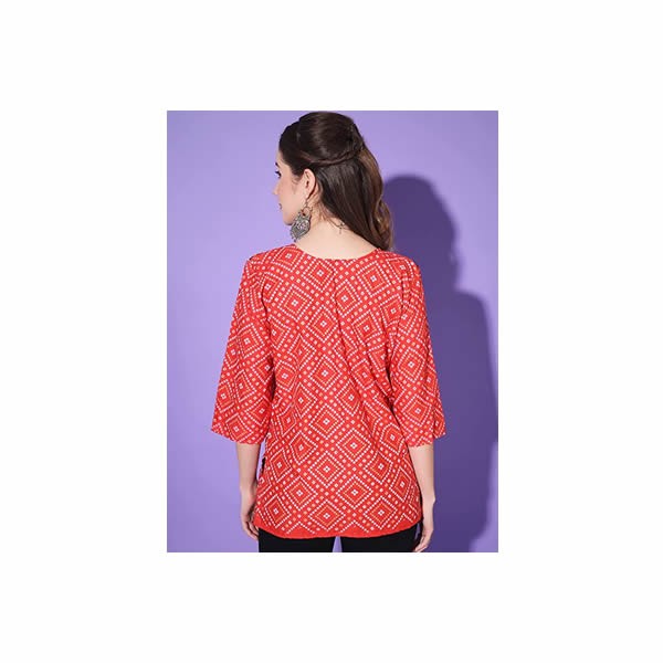 This printed short kurti is made of soft rayon fabric, round neck with V Cut, 3/4th sleeve, embroidery work on neck and printed on front area, gives this short kurti/top an awesome look, This can be used for festivals, parties and weddings and ideals for women and girls. Size Chart In Inches - Size : M "Bust 38 Length 26" Size : L "Bust 40 Length 26" Size : XL "Bust 42 Length 26" Size : XXL "Bust 44 Length 26"