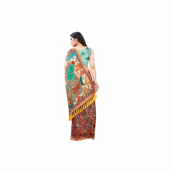 The elaborate work of tassel with kalamkari work gives a very elegant look to this saree. It jazzes up the appearance of all the special events and parties.