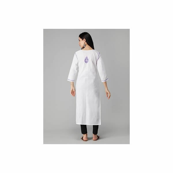 Product Code : SCL4243 Fabric: Cotton Length: 45 Inches Neck: Round-shape Sleeves: 3/4 Sleeves Slit Detail: Side slit Color: White Embroidery: Ghaspatti, Phanda Thread Color: Beige Washing Instructions: Handwash Only Delineation: Purchase this elegant and comfortable White chikan kurti online from Seva, is ideal for any fashionista. It has Beige-coloured rich and attractive chikan embroidery. Buy this classic kurti for any occasion, any festival and any party celebrations. Disclaimer: There may be some minor dissimilarities in crafting and embroidery than showcase image. Since it is handcrafted product and these minor differences are natural when the crafting procedure has human involvement. However, these crafting changes are beautiful likewise show uniqueness. Note: Product maybe altered down by one size if required. For instance, size 40 can be altered to size 38. Trivia: The chikankari work was initially done on white yarn known as tanzeb. Though embroidery has evolved with time it still remains delicate, intricate and graceful. The chikan garment goes through the production process anywhere between one to six months. The fabric is cut in the desired shape, followed by pre-embroidery work to get the desired shape of the embroidery. After printing the design on the semi-stitched garment the embroidery is begun. This is followed by a quality check. The garment is washed in a bhatti, dried and finished! There are in all 36 stitching techniques involved in Chikankari. Misspelled: Seva, Seva Chikan, Seva Chicken, Sewa Chickan, Sewa Chicken, Chikankarri Also known as: Stitched Kurti, Kurta, Top, Tunic, Unstitched Kurti, Chikankari Kurti, Sewa Chikan Kurti, Seva Chikan Kurti, Seva Chikan Online, Seva Chikan Saree, Chikan Shirt, Seva Women's Fashion
