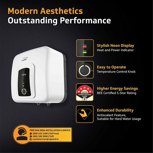V-Guard Calino 15L Storage 5 Star Water Heater, 100% ABS Body with IPX4 Rating; Free PAN India Installation and Free Inlet Outlet Connection Pipes; White