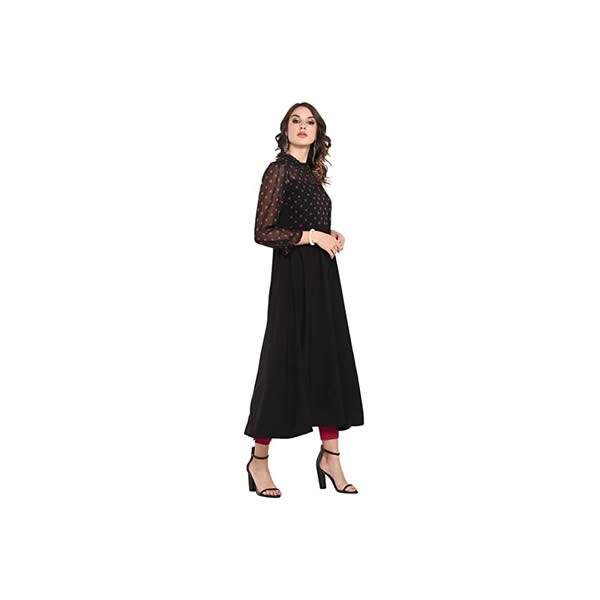 This stylish polka print kurta from janasya is made of poly crepe and comes in an attractive black color. It features full sleeve,high neck,a-line and it is ankle length kurta that is suitable for casual occasions. Team it with matching leggings for a chic look.