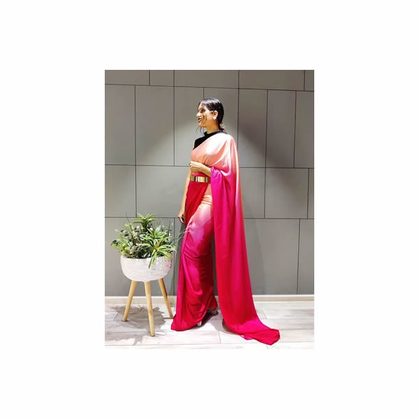 This Saree Made with Chinon Fabric and it's Free Size weist 26 to 44, & This saree comes with Black Colour unstitched Blouse piece