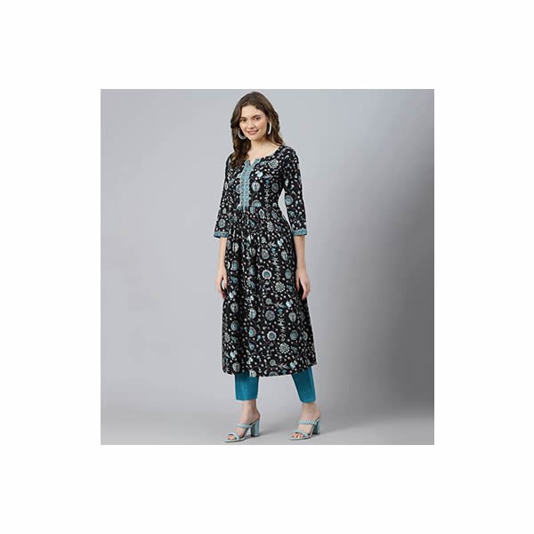 Women’s Cotton Readymade Salwar Suit Set. Printed Anarkali Flared Kurti Pant Dupatta Set Latest