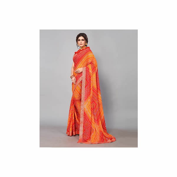 This Bandhani/Bandhej Foil Printed Georgette Saree With Lace border Blouse Piece for women is made on exclusive printing machine. Saree length is 6 .3m including blouse piece. Blouse is unstitched fabric and 0.80 meter. This saree looks beautiful in daily wear or office wear. This saree is for women. This is beautiful for women saree by Yashika on Amazon.