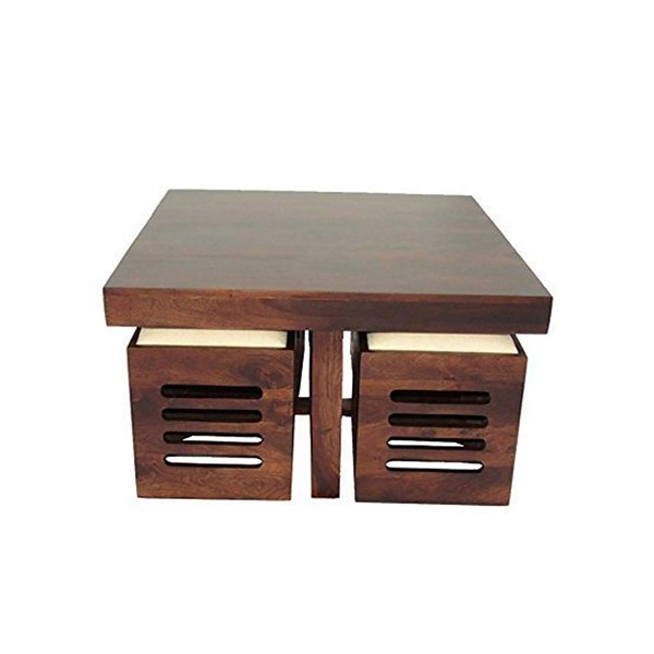 Rjkart Sheesham Wood Furniture Center Coffee Table with 4 Stools for Living Room Wooden Centre Teapoy Table Stool Chair for Home Office (Walnut Finish)